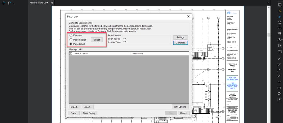 Next, add the files that you want to link. If you already have the file open, pick Add Open Files. Otherwise, feel free to include any additional files that you choose. Then you need to pick your search source by Region or Page Label. Tip: If you have already created Page Labels in Thumbnails or Bookmarks, this is the easiest way.